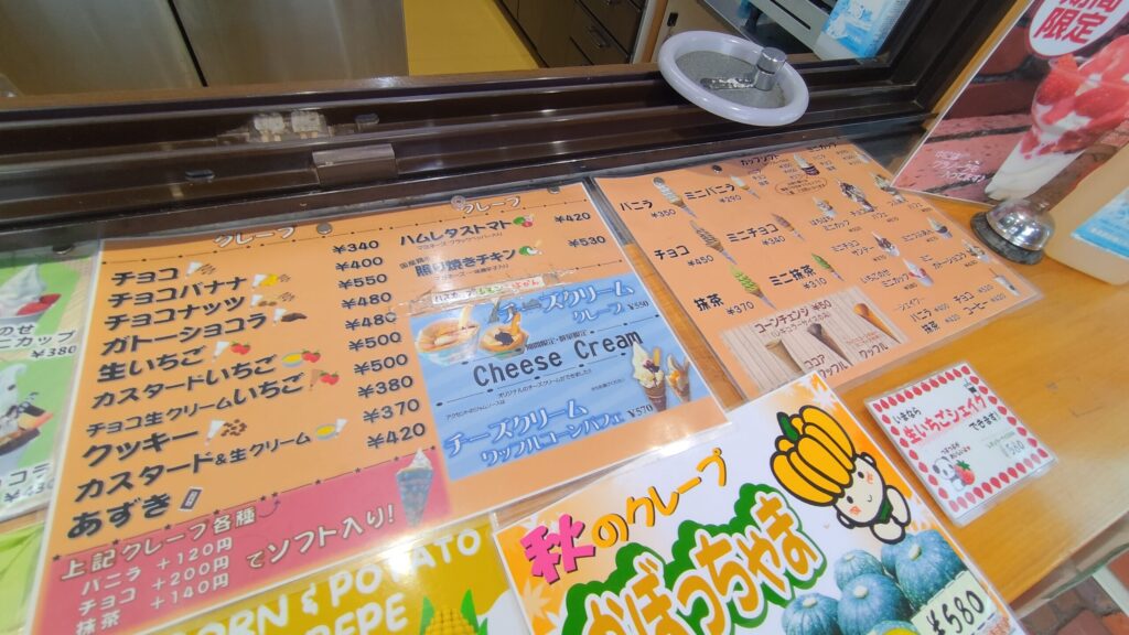 また、ソフトクリーム以外にもパフェやクレープがあり、クレープは甘いスイーツ系から照り焼きチキンなどの惣菜系まで幅広く揃っているので、大人から子どもまで楽しめるのも特徴です。