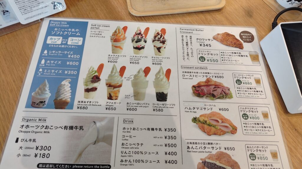 メニューはソフトクリームのほか、瓶入り牛乳やソフトクリームパフェ(なんと7種類!)、さらにクロワッサンやハムタマゴサンドなどの軽食までそろっています。ソフトクリームはおこっぺ牛乳を使用しているとのこと。
