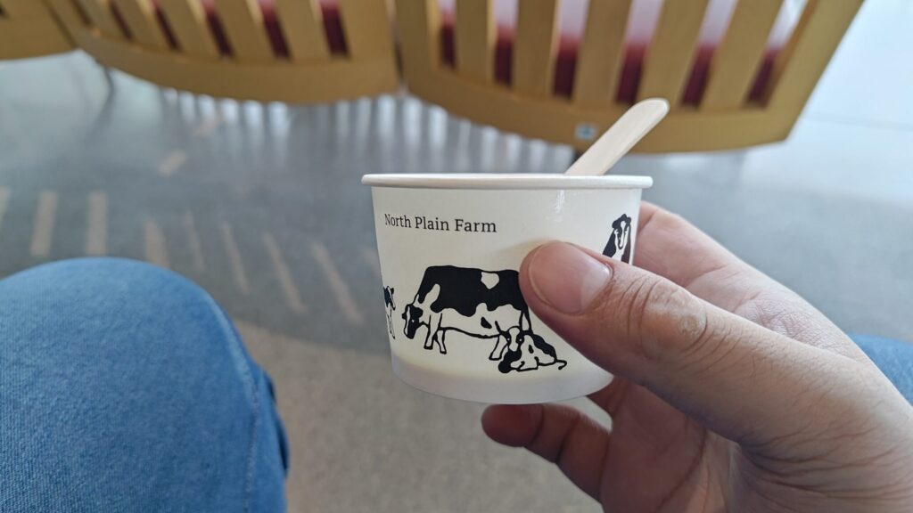 私は定番のソフトクリームを、今回は珍しくカップで注文しました。理由はこの後に別のお店でランチを食べる予定があったからです。(その話はまた次回!)