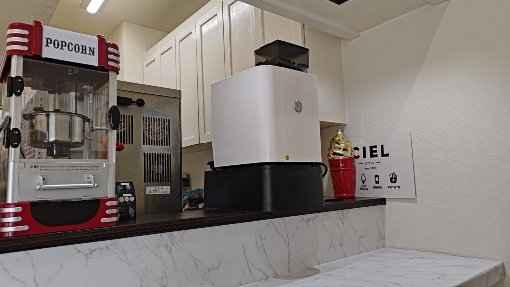 内装は白を基調としており、カラフルな綿あめが販売されていたり、レトロなポップコーンメーカーが置かれていたりと、どこか懐かしくも可愛らしい雰囲気。